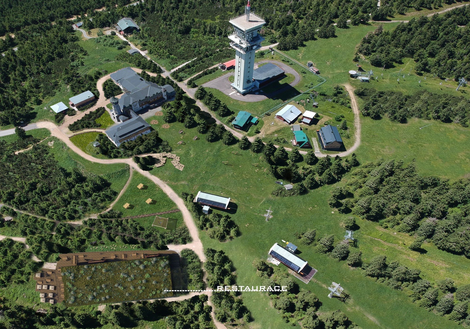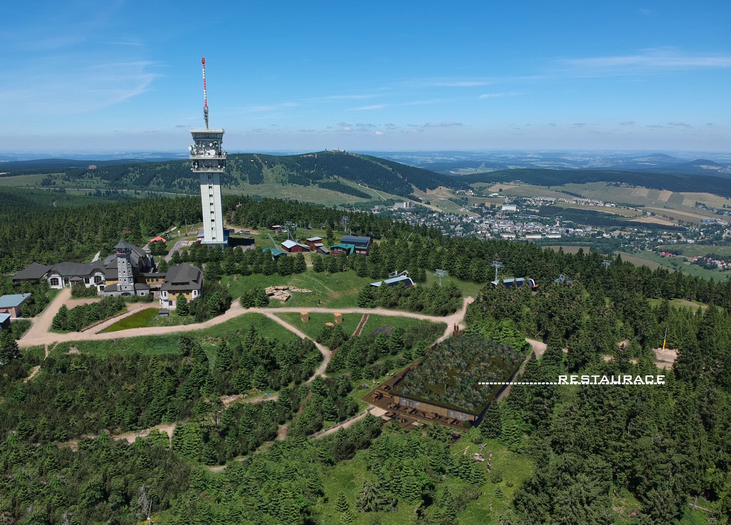 Vize: Zelený vrchol s restaurací, pěší stezky a věž přístupná veřejnosti