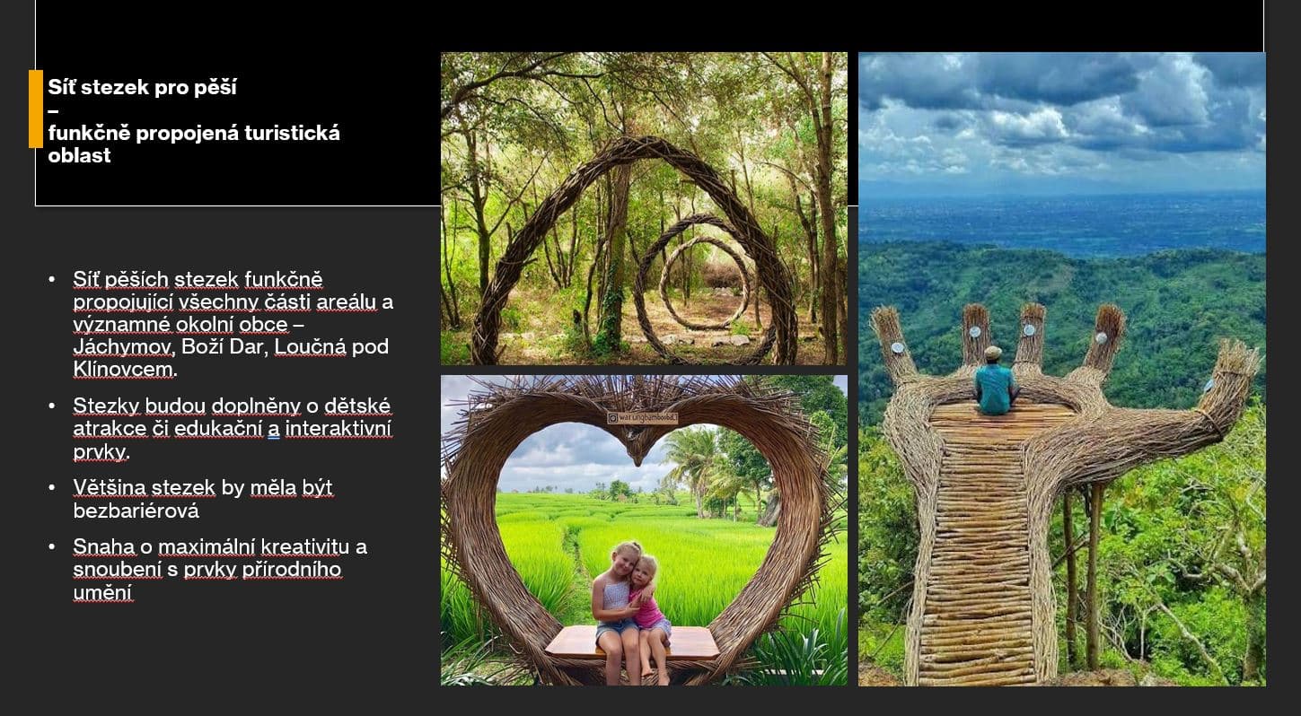 Celkově je naše představa vrcholu zelená, s opraveným hotelem, bez betonového parkoviště, a hlavně pro lidi. Na vrchol by také měla navazovat síť pěších stezek funkčně propojujících vrchol Klínovce s nejbližšími přilehlými městy (Boží dar, Jáchymov, Loučná pod Klínovcem). Trasy by měly obsahovat prvky přírodního umění či dřevěné herní části. Celou oblast by tak bylo možné projít po svých a přírodou!