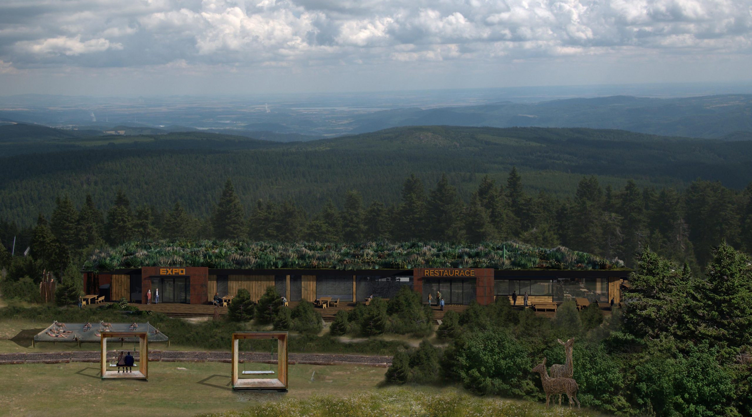 - vizualizace restaurace se zelenou střechou